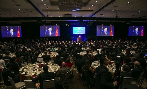 Các quan khách chăm chú lắng nghe Chủ tịch Tập Cận Bình phát biểu trong bữa tiệc tối ở thành phố Seattle để chào mừng nhà lãnh đạo Trung Quốc tới thăm Mỹ ngày 22.9. |