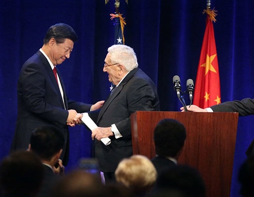 Ông Tập Cận Bình bắt tay cựu Ngoại trưởng Mỹ Henry Kissinger trên bục phát biểu trong bữa tiệc tối ở Seattle hôm 22.9. |