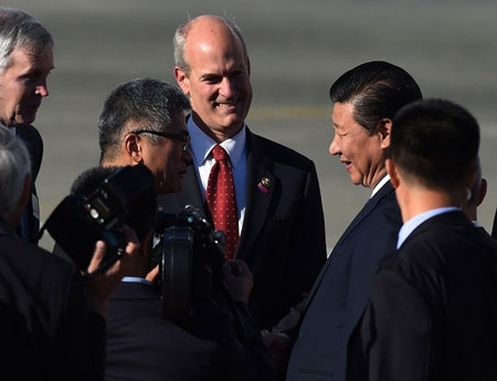Chủ tịch Trung Quốc bắt tay khi trò chuyện với ông Gary Locke, cựu đại sứ Mỹ tại Trung Quốc, tại sân bay. Chủ tịch Trung Quốc bắt đầu chuyến thăm chính thức Mỹ |