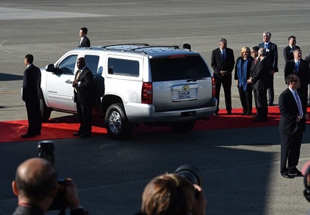 Nhân viên an ninh bảo vệ xung quanh chiếc xe Chevy Suburban chở Chủ tịch Tập Cận Bình và phu nhân chuẩn bị rời khỏi sân bay Paine Field. Theo New York Times, khi hội đàm với Tổng thống Obama, hai nhà lãnh đạo sẽ đề cập nhiều vấn đề nhưng quan trọng nhất là về an ninh mạng, tình hình Biển Đông và luật an ninh quốc gia mới của Nhật Bản. |