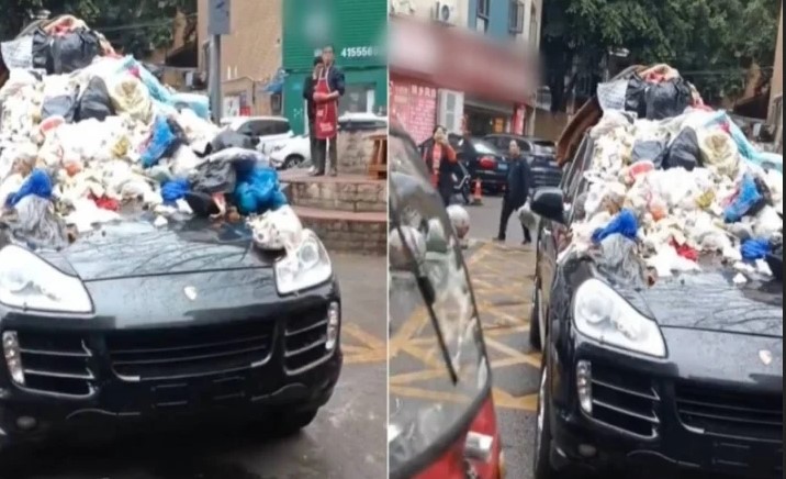 Khi phát hiện chiếc xe Porsche dừng đỗ sai quy định và che biển số, người dân trong khu vực được cho là đã lấy nhiều túi rác thải chất lên xe, khiến nóc xe và kính chắn gió vấy bẩn và bốc mùi khó ngửi.