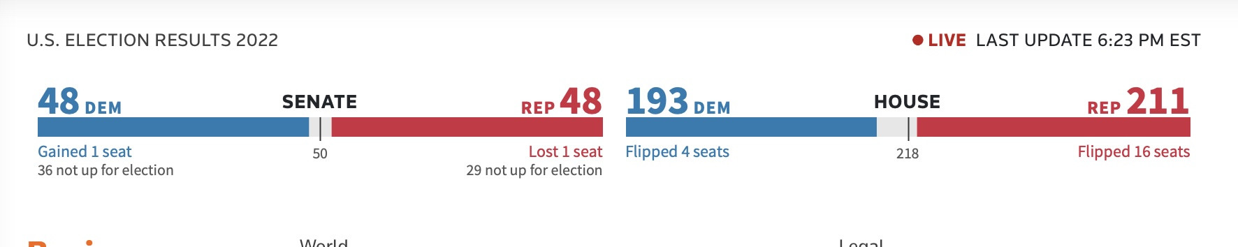 Trong khi đó, việc nắm quyền kiểm soát Thượng viện còn tùy thuộc vào cuộc đua sít sao ở một vài bang. Đảng nào sẽ giành chiến thắng còn phụ thuộc vào kết quả ở hai bang Nevada và Arizona, những nơi vẫn đang kiểm phiếu.
