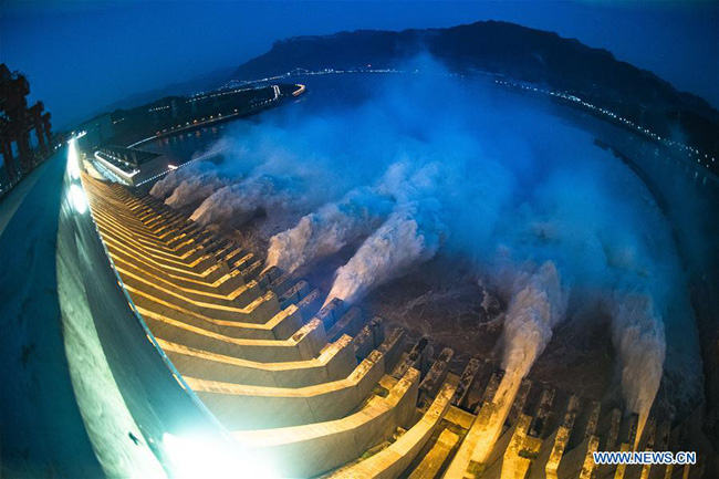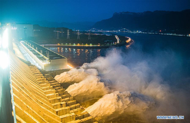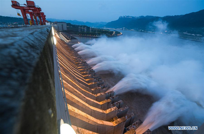Loạt ảnh đập Tam Hiệp mở 7 cửa để xả lũ vào tối ngày 19/7.