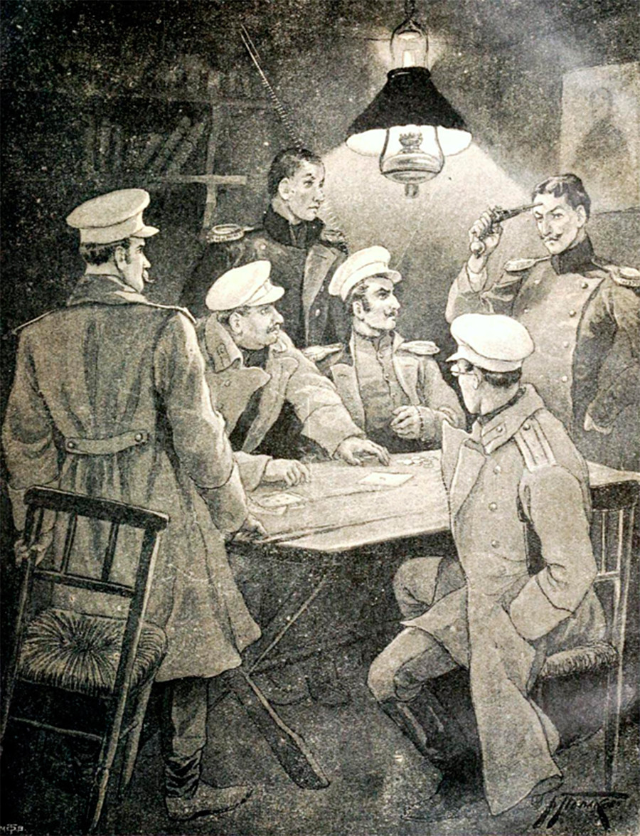 Câu chuyện hư cấu được kể lại bởi một người lính Pháp, người đã có cơ hội chứng kiến cách các sĩ quan Nga từ sau Cách mạng 1917 chơi trò này ở nhiều nơi, có thể là trong quán cà phê với bạn bè.