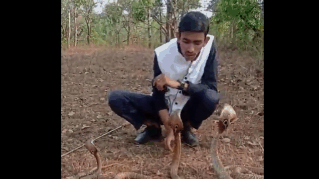 Nam thanh niên người Ấn Độ bất chấp nguy hiểm đùa nghịch với ba con rắn hổ mang, hậu quả là một trong số chúng đã cắn vào đầu gối của anh.