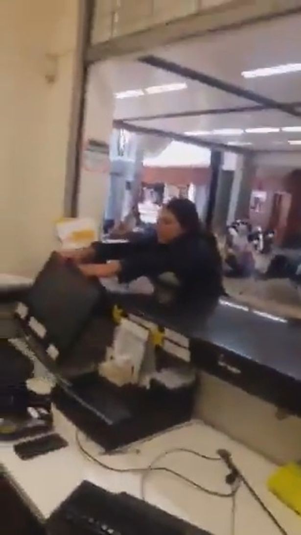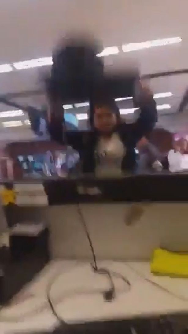 Đập vỡ một chiếc máy tính chưa hả giận, người phụ nữ này đập thêm một chiếc màn hình máy tính nữa và xông vào bên trong quầy để hành hung các nhân viên của Viva Air. Sau đó, cô ta bị một người đàn ông mặc đồng phục an ninh đến bắt đi.