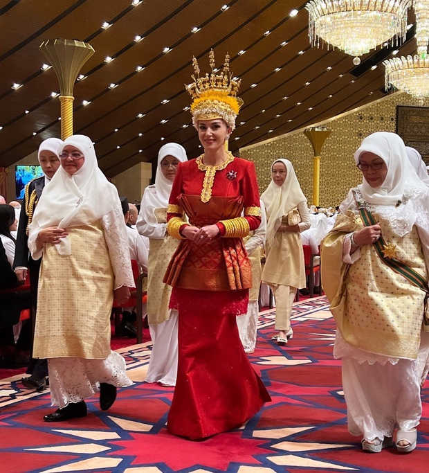 Với trang phục trong Lễ trao lời thề nguyện tại nhà thờ vào ngày 11/01 vừa qua, vợ của Hoàng tử Brunei lại diện trang phục cưới truyền thống với màu đỏ rực rỡ, đồng thời tô điểm cho trang phục của mình bằng hàng loạt phụ kiện vàng và chiếc mũ đội đầu cũng làm bằng vàng vô cùng hoành tráng.