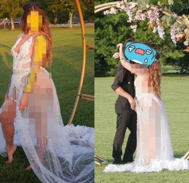 Tuy nhiên, cô dâu trong trường hợp này lại nhận nhiều lời chỉ trích và chê bai khi lựa chọn chiếc váy cưới gây sốc. Theo đó, 2 bức hình được chia sẻ trên mạng xã hội Reddit cho thấy, cô dâu lựa chọn một chiếc váy cưới rất mỏng, có thể nhìn xuyên thấu cả đồ lót bên trong. Phần ngực cũng được cắt xẻ đầy táo bạo khiến ai nhìn vào cũng phải đỏ mặt.