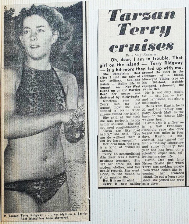 Những năm 1960, báo chí khắp nơi trên thế giới đồng loạt đưa tin về cô gái 19 tuổi được tìm thấy sống một mình trên hòn đảo hoang xa xôi ở Great Barrier Reef, vùng biển Queensland, nước Úc. Đó chính là Terrie Rigdway, người được thế giới gọi vui với cái tên "Robinson phiên bản nữ". Thậm chí, tin tức về cô còn hot đến nỗi hồi đó, trên một tờ báo Mỹ, họ còn rất nhanh dựng lên một cậu chuyện kể về Terrie với tiêu đề là: "Cô gái đồng tính hoang dã nước Úc", hay gọi cô là "Nữ thần mặc bikini".