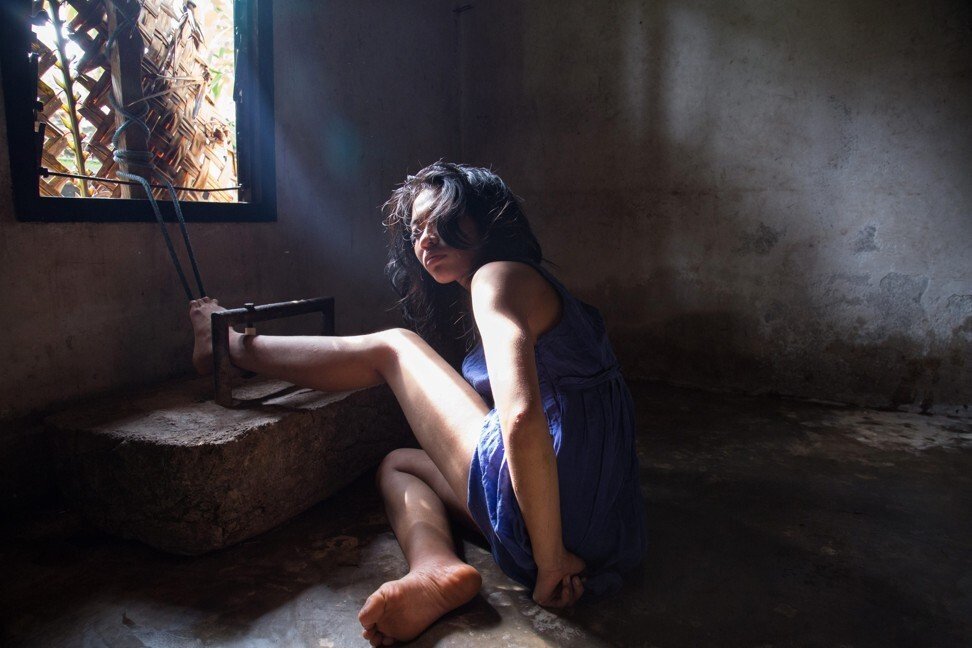 “Khi tôi gặp Kadek lần đầu vào cách đây 4 năm, cô ấy trông như thế này”, Rudi khoe một bức ảnh của Kadek trong bộ dạng đầu tóc bù xù, khuôn mặt nhăn nhó vì đau đớn, nằm trên đất trong tư thế vặn vẹo khủng khiếp, một chân được đặt lên tảng đá bê tông trong khi cổ chân bị cùm lại.