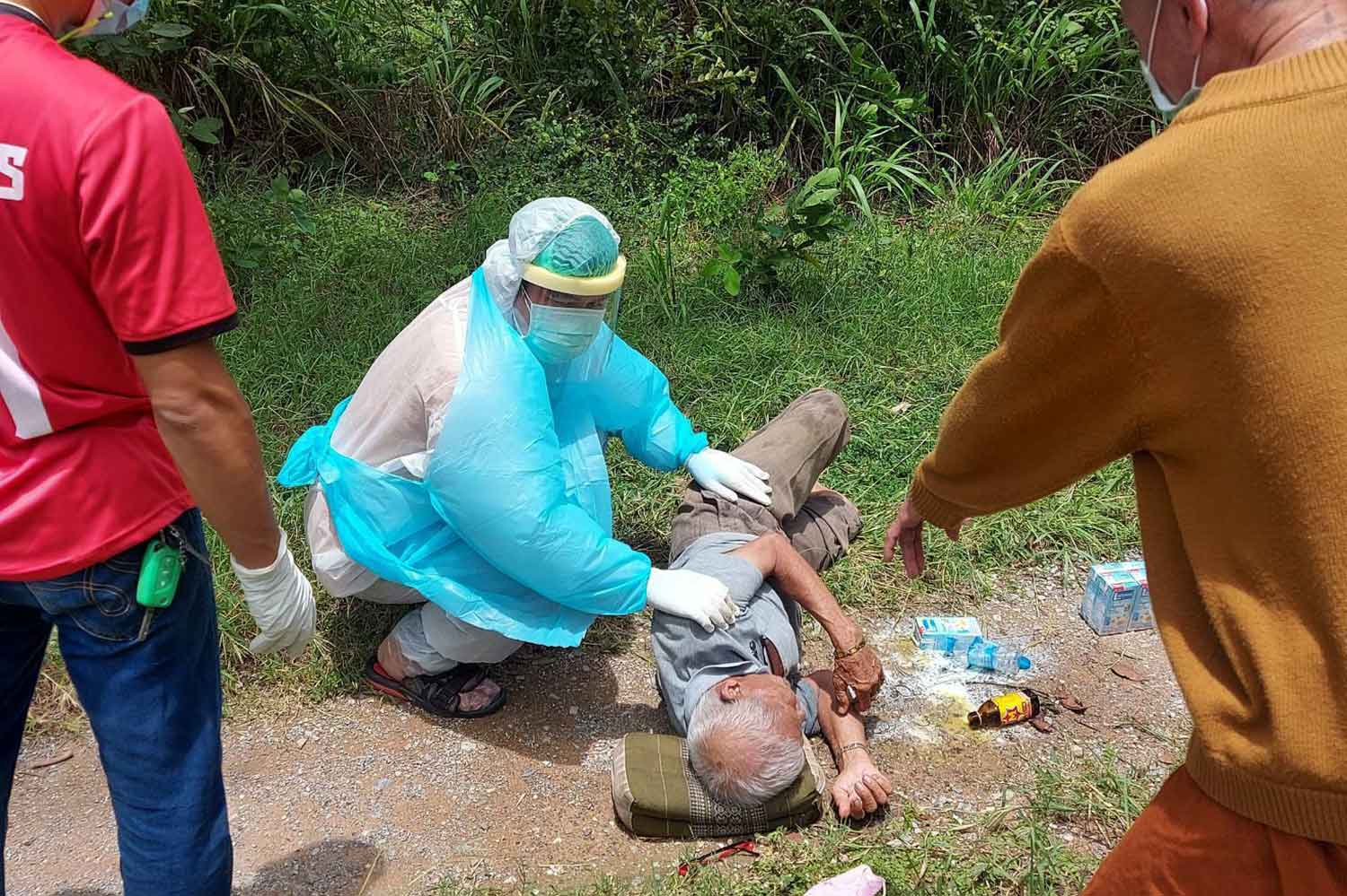 Một người dùng Facebook được cho là nhân viên y tế tại Bệnh viện quận Bua Yai đã đăng ảnh cụ già nằm trên con đường gần chùa Wat Pa Suan Thamma Sawaddee ở làng Ban Nong Waeng, quận Bu Lai.