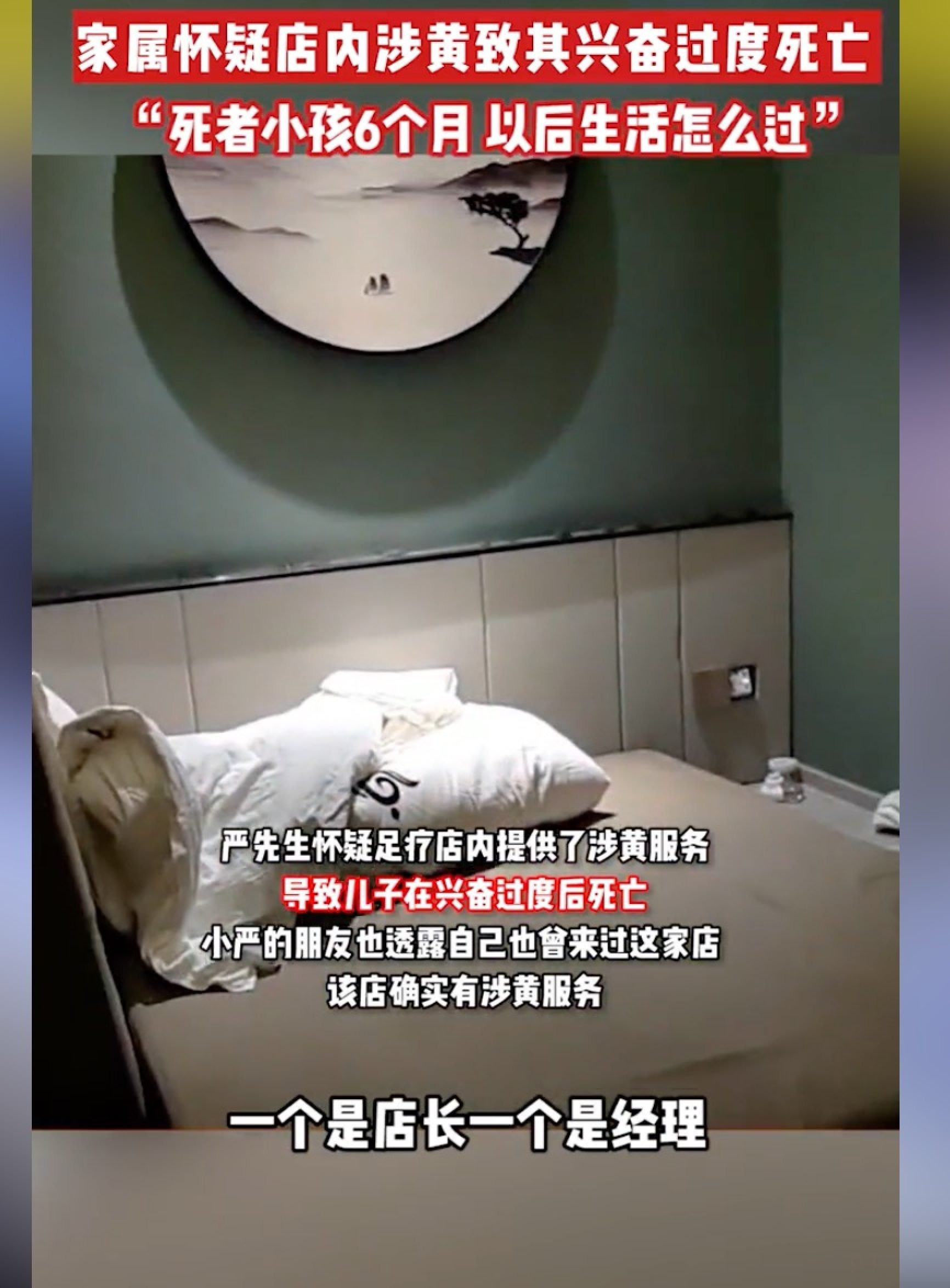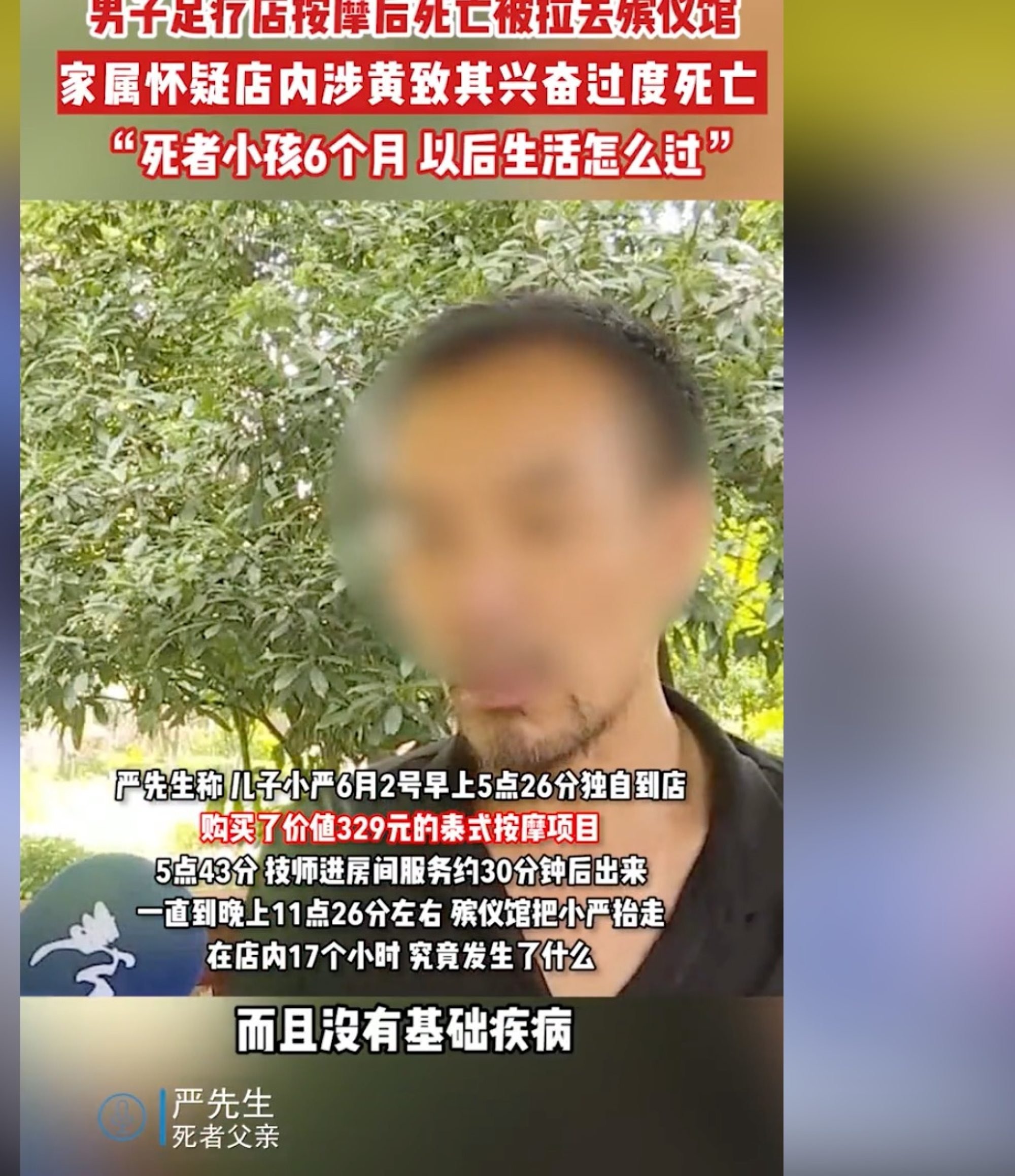 Theo báo cáo của Hubei Media Group, anh Nghiêm (Yan), 29 tuổi, con trai của người đàn ông nói trên đã chết bí ẩn tại tiệm massage hôm 2/6. Anh Nghiêm hiện đã có vợ và một cô con gái nhỏ.