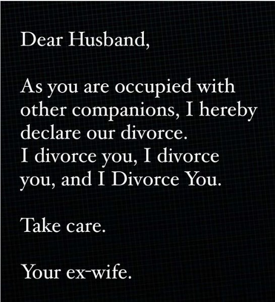 Công chúa Sheikha Mahra của Dubai đã lên mạng xã hội và chia sẻ với hơn 453.000 người theo dõi: "Chồng thân mến, Vì anh đang bận rộn với những em yêu khác ở bên ngoài nên em xin tuyên bố chúng ta ly hôn. Em ly hôn với anh, Em ly hôn với anh và Em ly hôn với anh. Hãy bảo trọng, thân gửi từ vợ cũ của anh".