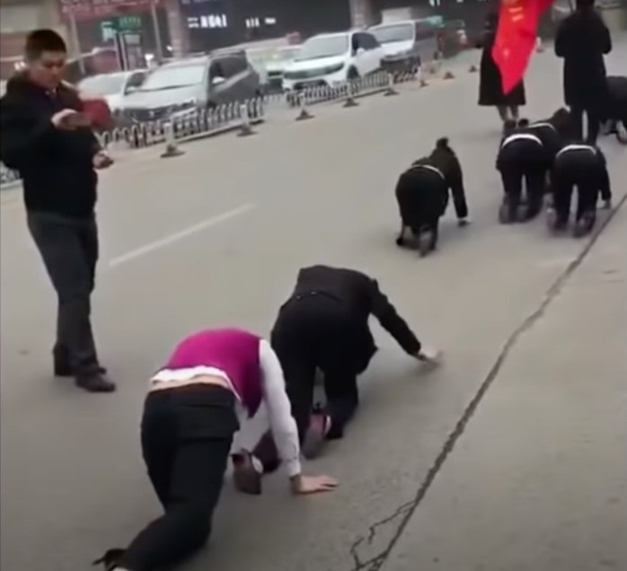 Trong đoạn video được một nhân chứng cho chia sẻ trên mạng xã hội, gần 10 người, trong đó chủ yếu là phụ nữ, mặc vest đồng phục đang phải bò bằng hai tay và đầu gối ngoài đường phía sau một nam giới cầm cờ đỏ có in tên công ty của họ - một doanh nghiệp chuyên về sản phẩm làm đẹp.