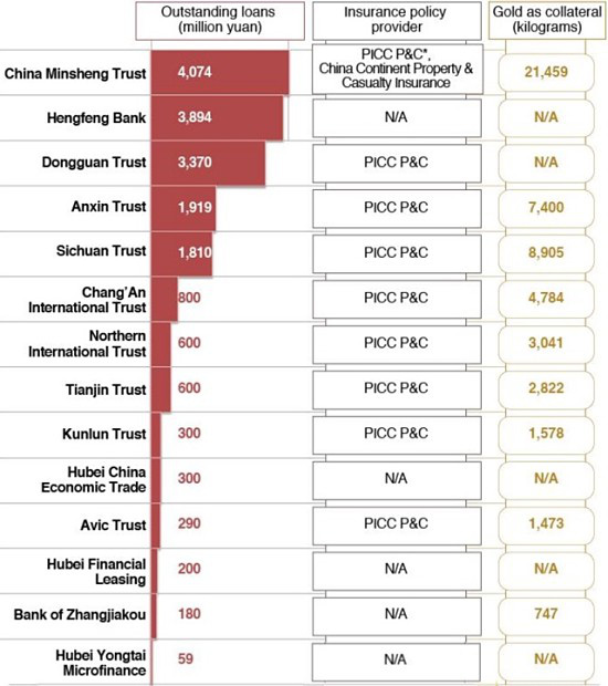 Cũng trong năm đó, Kingold đã cam kết sử dụng 54,7 tấn vàng để đảm bảo cho các khoản vay, cao gấp 7,5 lần so với năm trước. Các khoản vay mượn của Kingold đều được PICC P & C cung cấp các dịch vụ bảo hiểm, giúp hãng này dù chỉ có tài sản ròng trị giá 100 triệu nhân dân tệ trong năm 2016 và 2 tỷ nhân dân tệ trong năm 2017, vẫn có thể vay mượn được những khoản tiền khổng lồ.