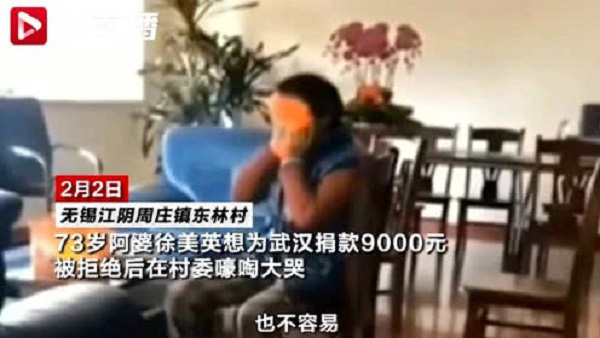 Không chỉ vậy, ngày 3/2, tại Ủy ban xã Đông Lâm, thị trấn Chu Trang (thành phố Giang Âm, tỉnh Giang Tô), một bà cụ ngồi ôm mặt khóc vì số tiền 10.000 nhân dân tệ mình quyên góp ủng hộ Vũ Hán bị từ chối. Cụ bà sống bằng nghề nhặt rác, khi nghe tin tức về dịch bệnh liền mang số tiền tích cóp được đến ủy ban để ủng hộ. Nhưng vì thương bà có hoàn cảnh khó khăn, cán bộ địa phương đã từ chối nhận. Bà cụ đau lòng liền bật khóc nức nở.