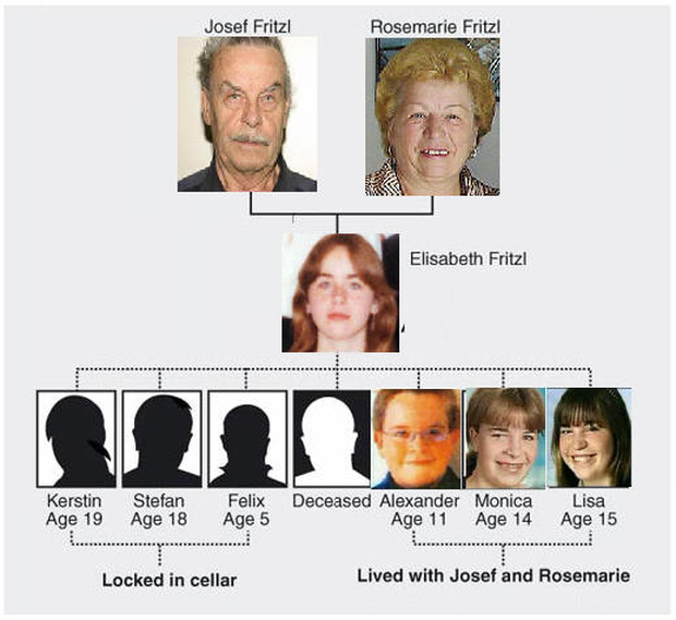 Josef đã biến con gái ruột của mình thành nô lệ tình dục của hắn. Sau 2 năm đầu tiên, Elisabeth mang thai và sảy thai chỉ 10 tuần. Rồi vào năm 1988, cô lại tiếp tục mang thai và sinh một bé gái tên Kerstin. 2 năm tiếp theo, một bé trai tên Stefan ra đời.
