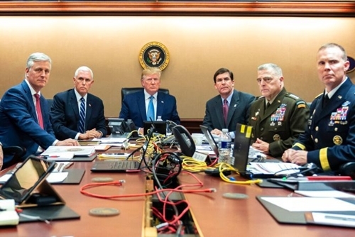 Cách đó nửa vòng Trái đất, Tổng thống Trump theo dõi cuộc đột kích kéo dài khoảng hai giờ qua video được truyền trực tiếp khi đặc nhiệm Mỹ vào hang ổ và kết liễu y. Ông miêu tả nó "như thể bạn đang xem một bộ phim".