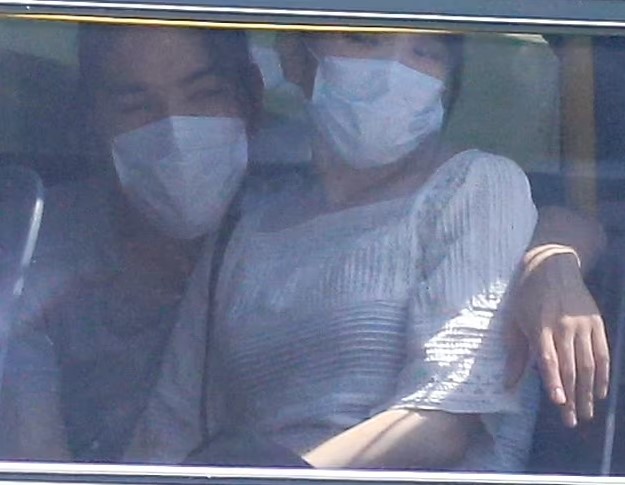 Trong những tấm ảnh khác, hai người đeo khẩu trang lên xe bus, ngồi cạnh nhau. Kei Komuro sau đó khoác tay lên vai Mako.