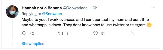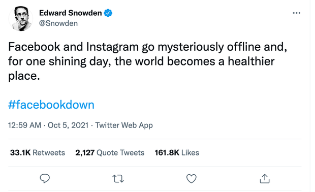 Đối với việc Facebook gặp lỗi sự cố trên toàn cầu, Edward Snowden đã có chia sẻ gây nhiều chú ý. Anh cho rằng việc Facebook và Instagram bất ngờ biến mất trong một ngày đẹp trời đã khiến thế giới trở thành một nơi trong lành hơn. Chia sẻ này nhanh chóng nhận được gần 200K lượt like chứng tỏ rất nhiều người quan tâm đến ý kiến với Edward. Tuy nhiên nó cũng vấp phải nhiều sự tranh cãi, khi nhiều người cho rằng Facebook thật sự quan trọng với họ. Nó đã trở nên phổ biến đối với tất cả mọi người, từ người già, đến trẻ em và nó khiến việc liên lạc và kết nối dễ hơn bao giờ hết.