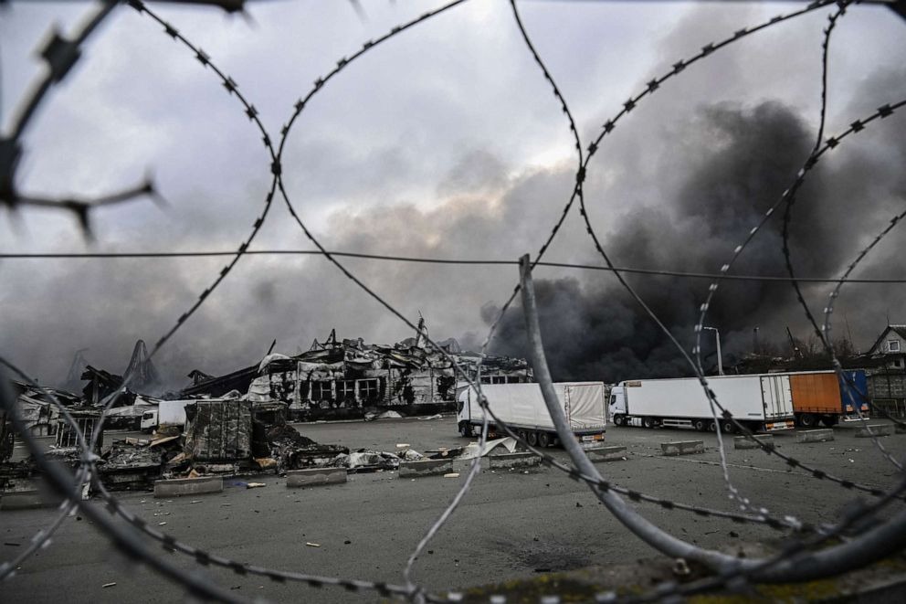 Khói bốc lên từ một nhà kho bị đánh bom ở thị trấn Stoyanka, phía tây Kyiv, ngày 4/3/2022. Ảnh: AFP/Getty Images