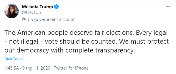 Mặc dù vậy, vào ngày 8/11, bà Melania Trump đã bất ngờ đưa ra tuyên bố công khai đầu tiên của mình về cuộc bầu cử trên tài khoản Twitter chính thức, nói rằng các phiếu bầu vẫn nên được tính và mọi thứ đều cần sự minh bạch. Điều này cho thấy bà ngầm ủng hộ ông Trump và không tin vào kết quả bầu cử hiện tại.