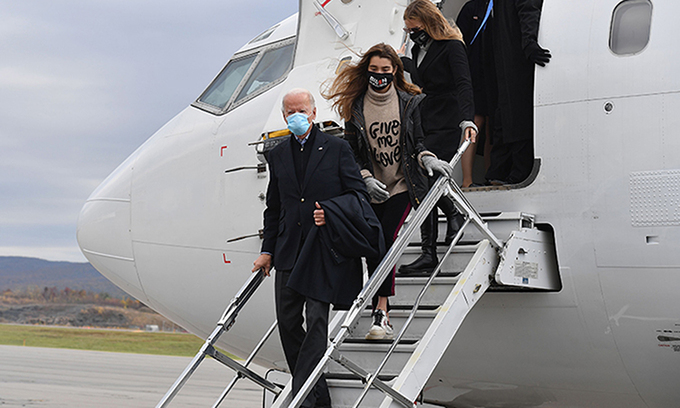 Ứng viên Dân chủ Joe Biden (trước) rời máy bay tại Scranton, bang Pennsylvania hôm 3/11. Ảnh: AFP.