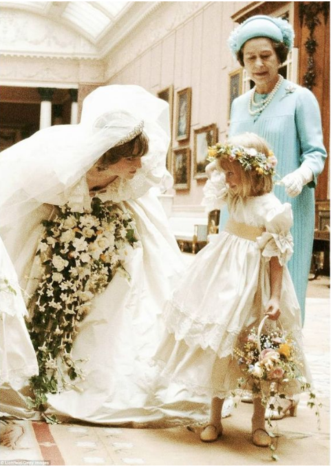 Trong 1 bức ảnh hậu trường, cố công nương đã trấn an bé phù dâu 5 tuổi Clementine Hambro khi thấy bé có vẻ lo lắng trong khi Nữ hoàng Elizabeth đứng gần đó.