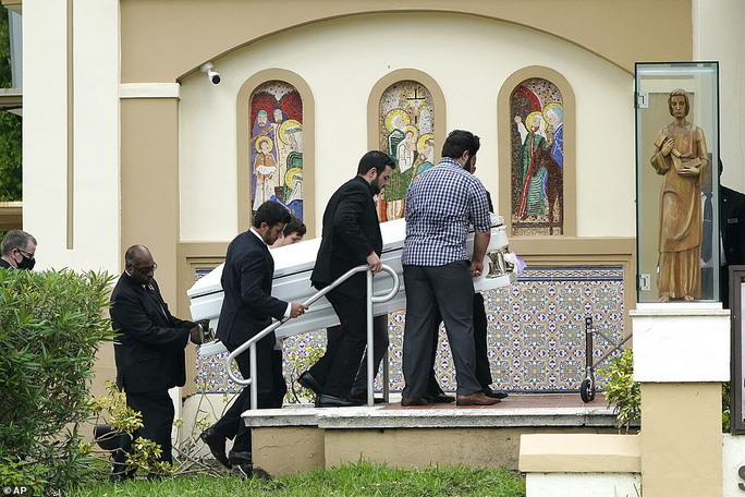 Tại một nhà thờ gần đó, nhiều người đau buồn khi có mặt tại tang lễ của cụ bà Hilda Noriega, 92 tuổi, một trong số những nạn nhân của vụ sập chung cư 12 tầng Champlain Towers South ở Surfside.