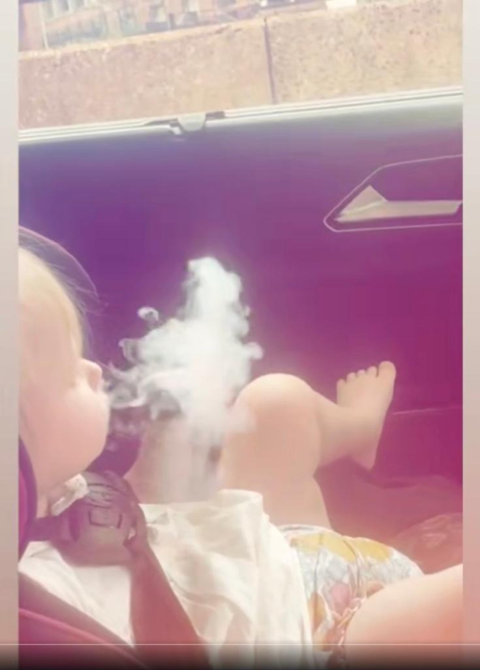 Đứa trẻ (được cho là khoảng 2 tuổi), ngồi cố định trên ghế trẻ em có thắt dây an toàn, gọi "Nanny" và dường như nhắc đến điếu thuốc lá điện tử dùng một lần trên tay trước khi hít một hơi.