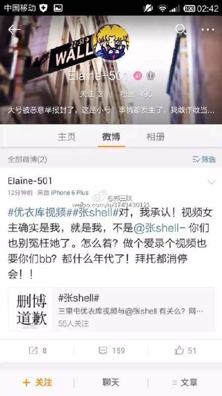 Hai "nhân vật chính" trong clip cũng nhanh chóng được cư dân mạng tìm ra danh tính. Nickname @Elaine_051 trên Weibo sáng nay (15/7) đã thừa nhận mình là "nữ chính" trong clip "nóng".