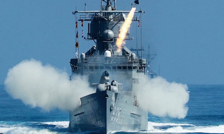 Tàu hộ tống lớp Perry của Đài Loan diễn tập phóng tên lửa chống ngầm. Ảnh: CNA |