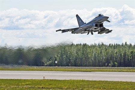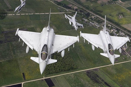 | Người phát ngôn của hãng Boeing, ông Jay Krishnan cho hay: "Chúng tôi tin rằng Boeing có khả năng cơ động, giám sát tình báo và trinh sát mà có thể đáp ứng nhu cầu hiện đại hóa của Việt Nam" và cam kết "Bất kỳ doanh số bán hàng liên quan đến quốc phòng với Việt Nam sẽ thực hiện theo chính sách của Chính phủ Mỹ và Việt Nam". Trong ảnh: Tiêm kích Typhoon. |