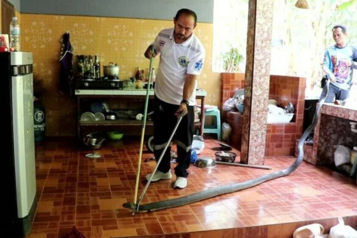 Một phụ nữ 55 tuổi ở tỉnh Chumphon, Thái Lan đã giật mình khi một con rắn hổ mang chúa dài 4 mét, nặng hơn 8 kg trườn vào bếp. Người này đã lập tức bỏ dở bữa ăn và gọi dịch vụ khẩn cấp để được hỗ trợ.