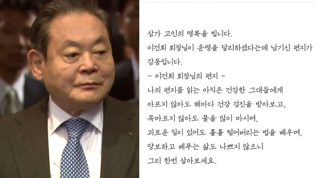 Và giữa vòng xoáy chú ý, một bức thư có nhan đề “Bức thư cuối cùng của Chủ tịch Lee Kun-hee để lại” bỗng xuất hiện và lan truyền rộng rãi trong nhiều diễn đàn trang mạng tại Hàn Quốc. Thậm chí lan rộng sang cả Việt Nam.