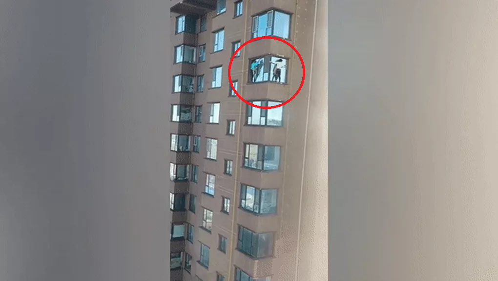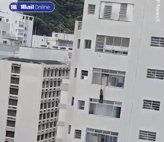 Hình ảnh cho thấy người phụ nữ đang bám víu bằng đầu ngón tay trong lúc đang treo mình lơ lửng bên ngoài cửa sổ tầng 16 của tòa nhà. Phía dưới đường, những người dân chứng kiến sự việc không khỏi bàng hoàng. Nhiều người đã lớn tiếng la hét tìm kiếm sự giúp đỡ thay người phụ nữ.