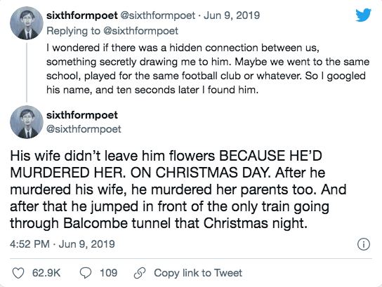 Vào tháng 6/2019, người dùng Twitter sở hữu tài khoản @sixthformpoet có tên là Matt, đến từ Anh, đã chia sẻ câu chuyện về cuộc gặp gỡ lạ đời, chứa đầy "cú twist" cực kỳ khó quên của anh và người vợ hiện tại. Mọi chuyện bắt đầu bằng sự tình cờ nhưng có vẻ như đều đã được số phận sắp đặt sẵn.