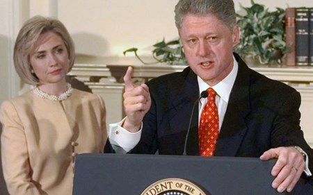 Cựu Đệ nhất phu nhân Hillary sát cánh bên cạnh chồng, cựu Tổng thống Bill Clinton khi ông trần tình về vụ bê bối ngoại tình với cô thực tập sinh Monica Lewinsky tại Nhà Trắng ngày 26.1.1998. |