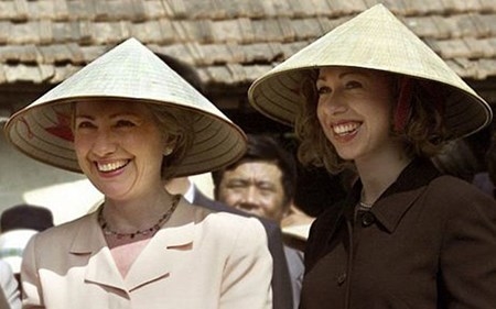 Bà Hillary Clinton và cô con gái duy nhất Chelsea duyên dáng trong chiếc nón lá truyền thống của Việt Nam trong chuyến thăm đầu tiên tới Việt Nam năm 2000 cùng chồng, cựu Tổng thống Mỹ Bill Clinton. (Ảnh: AP) |
