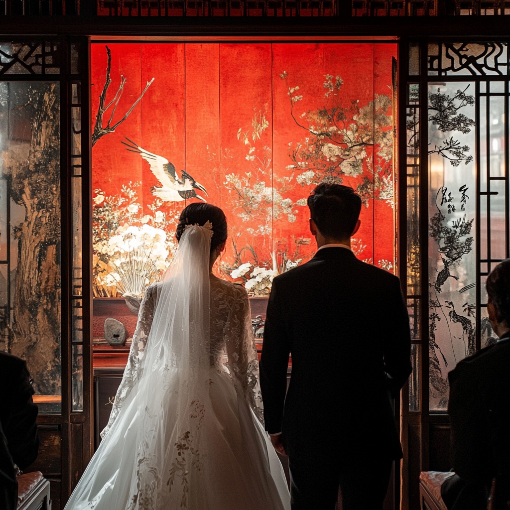 Ông Sư Mộ Niên căng thẳng đến mức tay mình đổ mồ hôi, nhìn ngắm cô dâu trẻ đẹp trước mắt, trong lòng vừa hạnh phúc vừa bồn chồn. Lâm Du Nhạn mỉm cười, ánh mắt lấp lánh niềm mong ước về tương lai, cô nhẹ nhàng nắm lấy tay ông Sư, âu yếm nói: “Mộ Niên, từ giờ trở đi, chúng ta sẽ là chỗ dựa vững chắc cho nhau”.