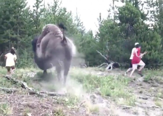 Sự việc xảy ra tại Công viên quốc gia Yellowstone (Mỹ). Video ghi lại sự việc cho thấy con bò rừng khổng lồ đang gặm cỏ trên sườn đồi trước khi nhìn thấy hai người lớn và một bé gái đi trên con đường trước mặt. Sau đó, con vật hoang dã đột ngột phi nước đại về phía nhóm người, có thể thấy rõ bụi cát hất tung mù mịt dưới chân nó.