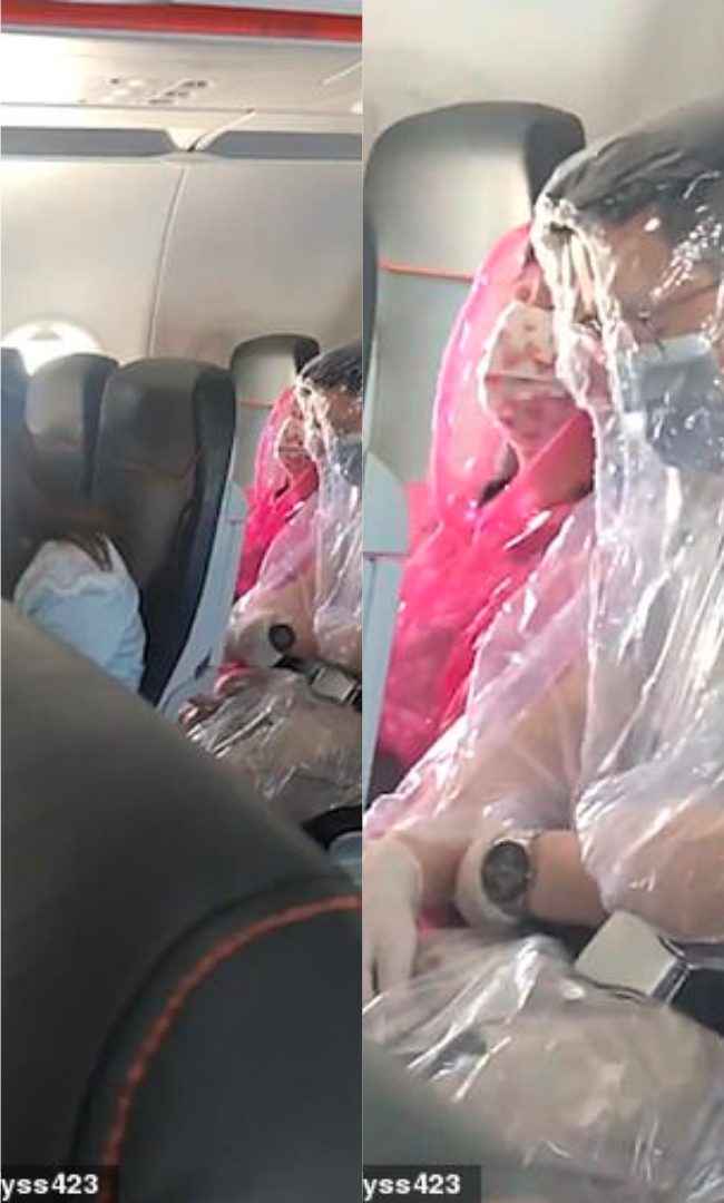 Đoạn video ngắn cho thấy hai hành khách ngồi im trên ghế. Tuy nhiên họ lại gây chú ý bởi cách "trang bị" chống corona có chút "khác người". Người đàn ông thì mặc một chiếc áo mưa trong suốt, kín mít, chỉ để lộ một khoảng nhỏ ở mắt và quanh mũi, bên cạnh đó anh ta còn đeo khẩu trang và găng tay y tế cẩn thận. Người phụ nữ ngồi bên cạnh anh cũng được "bọc lót tỉ mỉ" với chiếc áo mưa màu hồng và khẩu trang in hình trái tim.