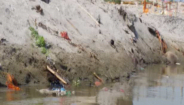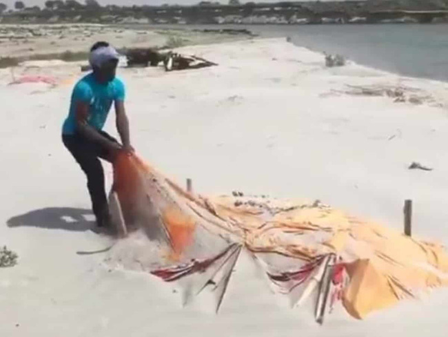 Một đoạn video được quay ở một vị trí khác cho thấy 2 người đàn ông đang vớt một thi thể được bọc vải liệm từ dưới sông lên và đặt trên bờ cát. Những ngày gần đây, hình ảnh vớt xác người từ sông rồi hỏa táng xuất hiện tràn lan.