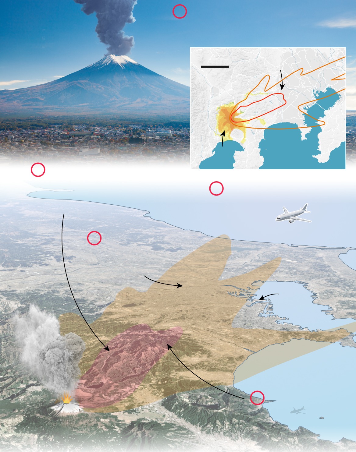 Chuyên gia nhận định nếu núi Phú Sĩ ngày nay phun trào quy mô lớn thì sẽ tạo ra khoảng 1,7 tỉ m3 tro bụi, trong đó phun khoảng 490 triệu m3 tro bụi vào khí quyển - gấp 10 lần lượng tro bụi do thảm hoạ kép động đất - sóng thần năm 2011 tạo ra mà hậu quả của nó vẫn còn đến hôm nay.