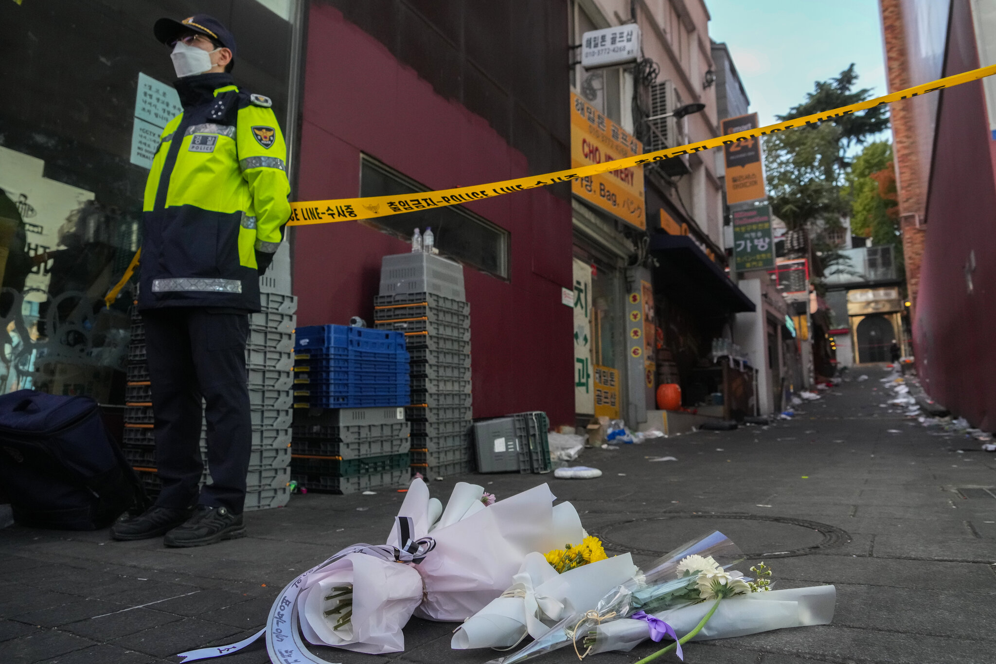 Chiều muộn 30/10, bầu không khí tang thương bao trùm khắp khu vực Itaewon. Cảnh sát chặn các con đường quanh khu vực, nhiều quán bar, nhà hàng đóng cửa, chăng biểu ngữ bày tỏ sự tiếc thương các nạn nhân. Nhiều điểm tưởng niệm đơn giản được dựng lên dọc các con đường.