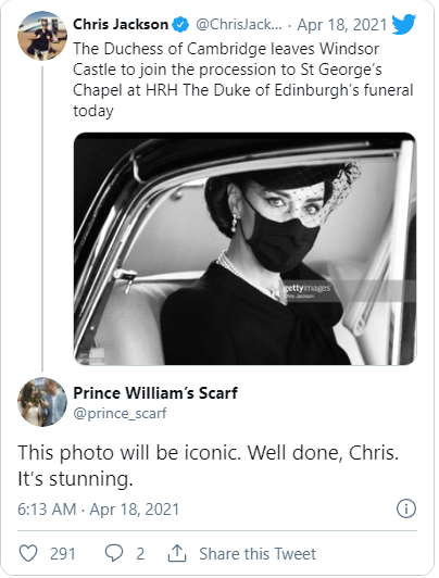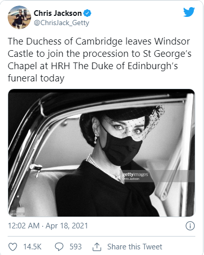 Vào ngày 18/4, nhiếp ảnh gia Jackson đã chia sẻ hình ảnh trên với màu ảnh đen trắng lên tài khoản Twitter cá nhân của mình kèm theo chú thích: "Nữ công tước xứ Cambridge rời Lâu đài Windsor để tham gia đoàn đưa tang tới nhà nguyện St George trong lễ tang của Công tước xứ Edinburgh".
