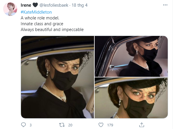 Sau tang lễ Hoàng tế Philip hôm 17/4, Công nương Kate trở thành tâm điểm chú ý của truyền thông và nhận được vô số lời khen ngợi. Nữ công tước xứ Cambridge không chỉ ghi điểm tuyệt đối với lối ứng xử tinh tế trong tang lễ, nhất là việc trở thành cầu nối giúp Harry và William hòa giải với nhau, bà mẹ 3 con còn gây bão mạng xã hội bởi vẻ đẹp hoàn hảo của mình.