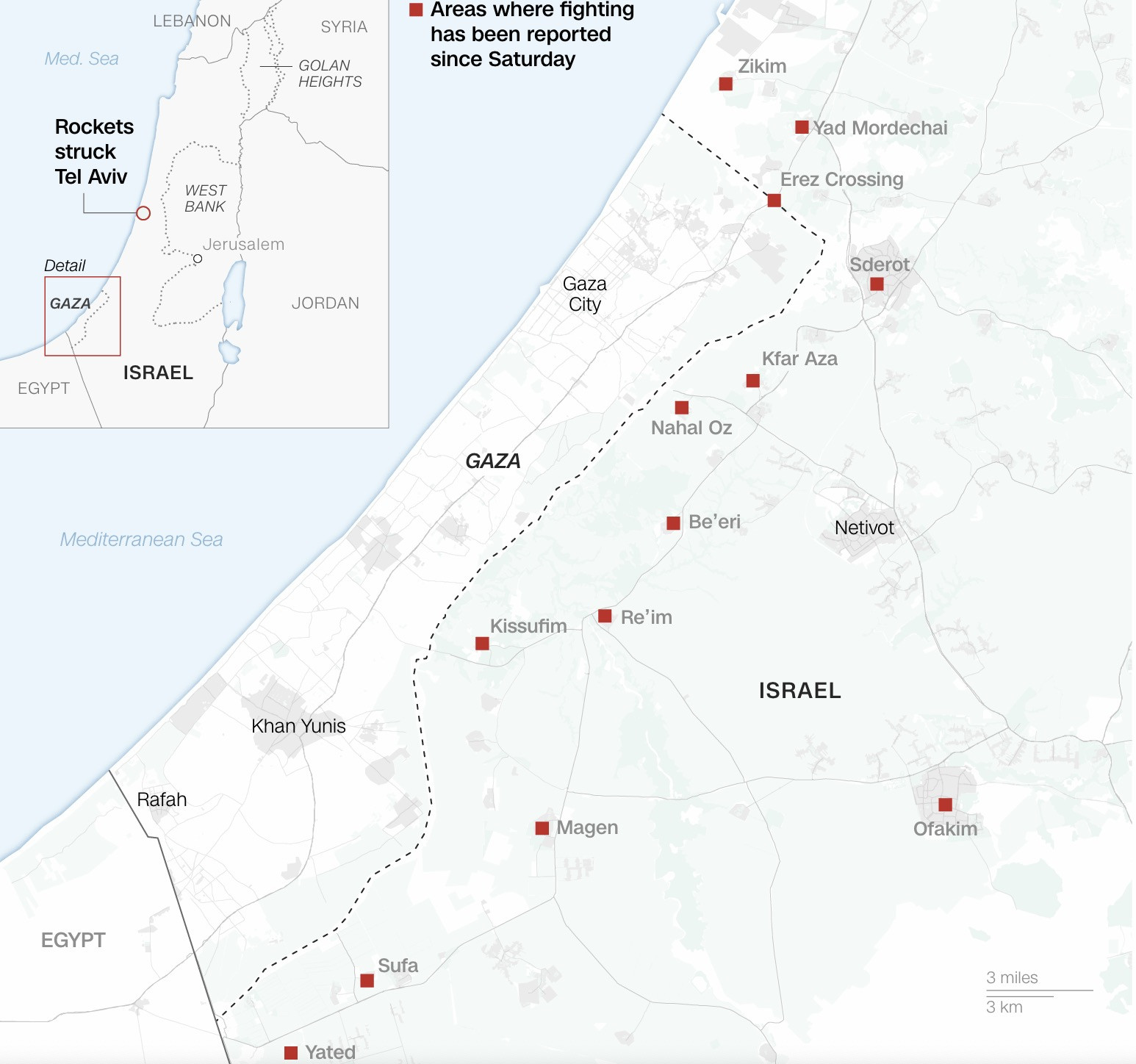 Các chiến binh Hamas đã tràn vào Gaza từ mọi hướng. Theo giới chức Israel, lực lượng Hamas tấn công vào 27 địa điểm khác nhau. Nơi xa nhất mà Hamas thâm nhập được vào là thị trấn Ofakim của Israel, nằm cách Gaza 22,5km về phía đông.