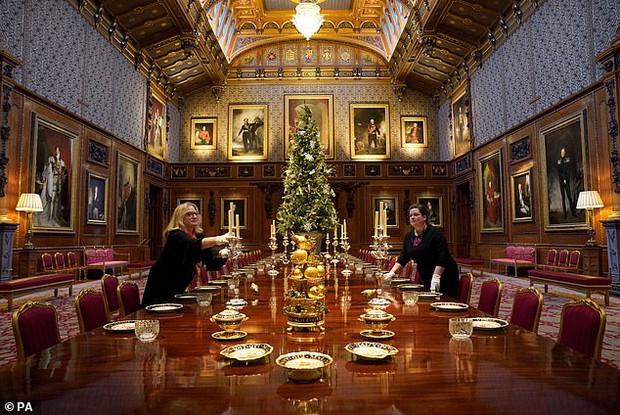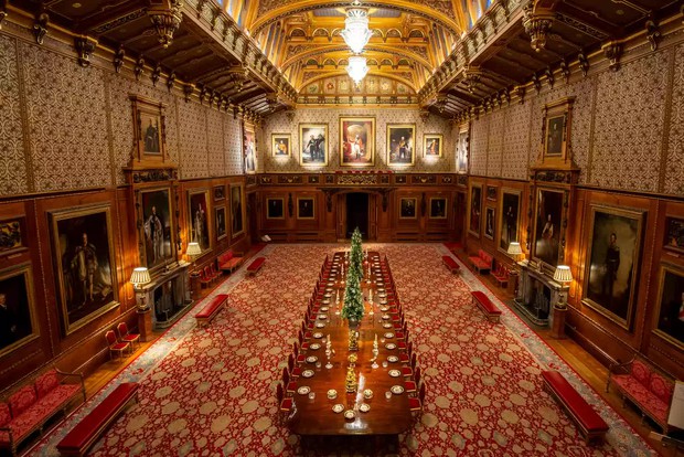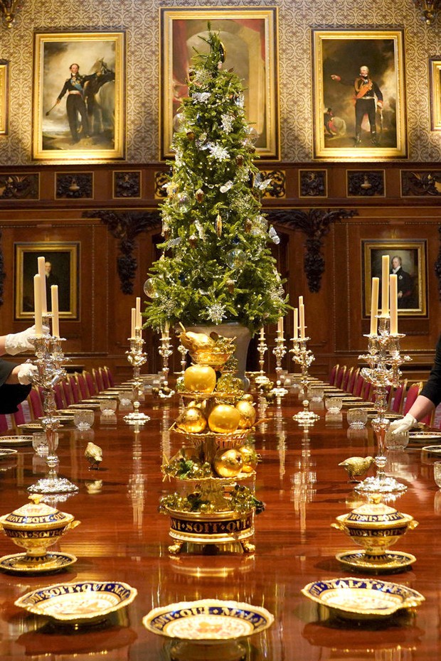 Không chỉ tại sảnh St.George, bầu không khí Giáng sinh cũng tràn ngập ở mọi ngóc ngách lâu đài. Tại phòng Waterloo, một bàn ăn khổng lồ đã được trang hoàng đặc biệt bằng những món đồ mang tông vàng, bát đĩa sang trọng, chân nến và các khay đựng trái cây đẹp mắt.