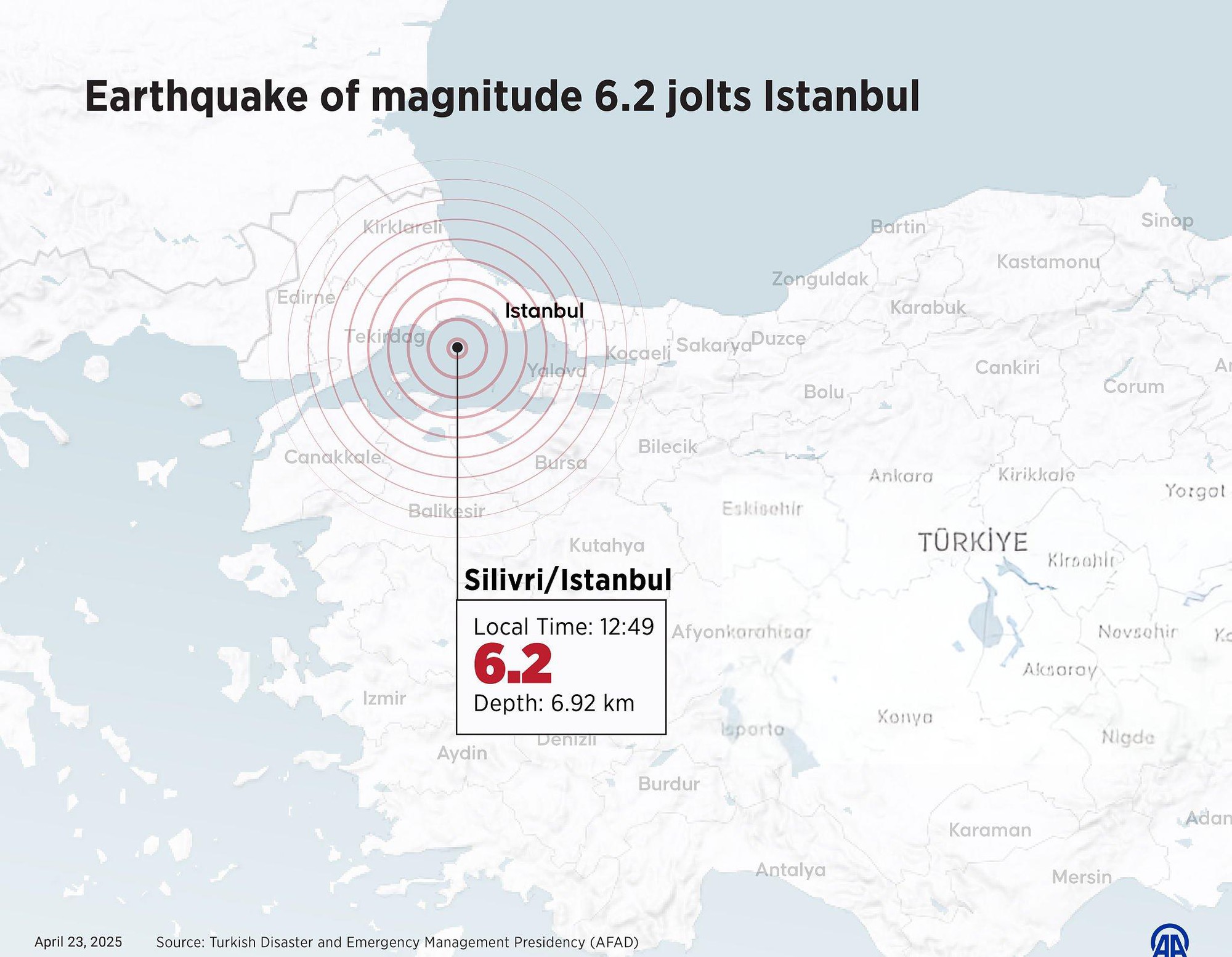 Chiều ngày 23/4, Thổ Nhĩ Kỳ phải hứng chịu một trận động đất mạnh 6,2 độ richter làm rung chuyển thủ đô Istanbul cùng nhiều khu vực lân cận. Cơ quan thảm họa AFAD của Thổ Nhĩ Kỳ cho biết tâm chấn trận động đất nằm ở độ sâu 6,92km, cách thủ đô Istanbul hơn 80km.